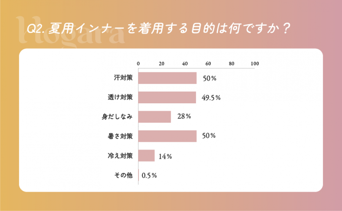 夏用インナーの着用目的として、「汗対策」「暑さ対策」を挙げる方が全体の約半数でした。