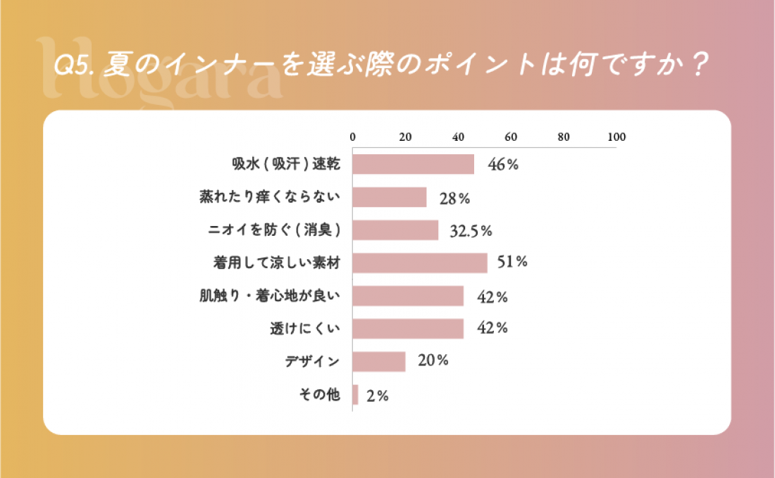 「着用して涼しい素材」は、夏インナー選びで最も大切にしている方が約半数でした。