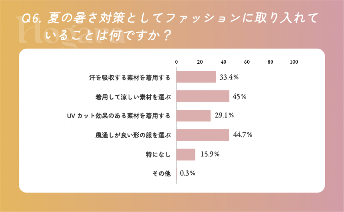 「着用して涼しい素材を選ぶ(45%)」「汗を吸収する素材を取り入れる(33.4%)」