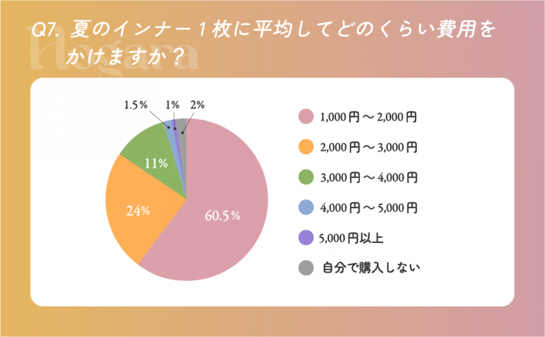 夏インナーの購入予算は、1,000円〜2,000円が60.5%、続いて2,000円〜3,000円24%という結果に。