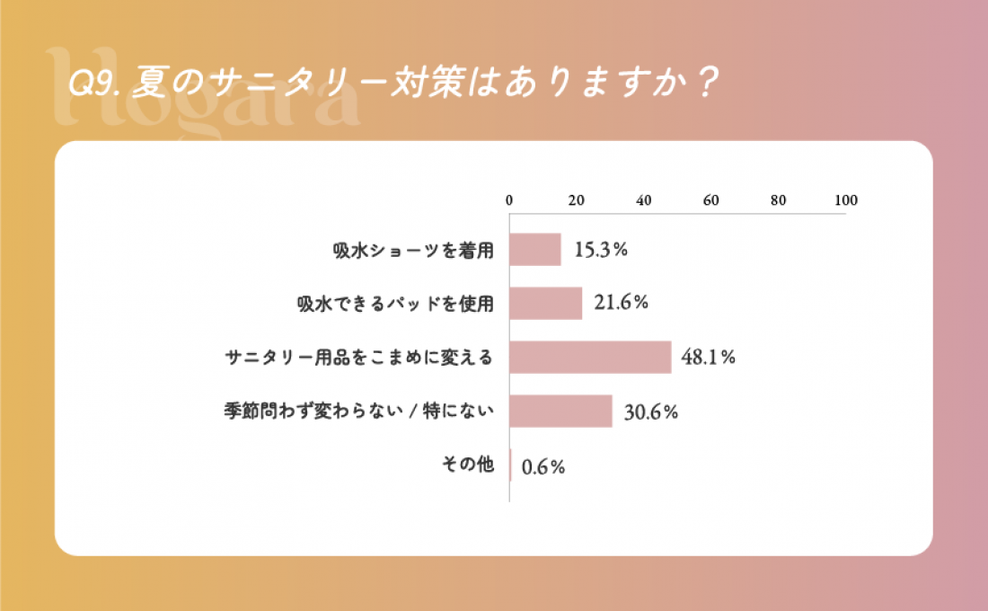 今回実施したアンケートでは、夏のサニタリー対策として「こまめにサニタリー用品を変える」という回答が多かったものの、
