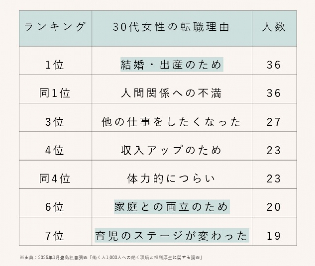 「結婚・出産のため」「家庭との両立のため」「育児のステージの変化」など、