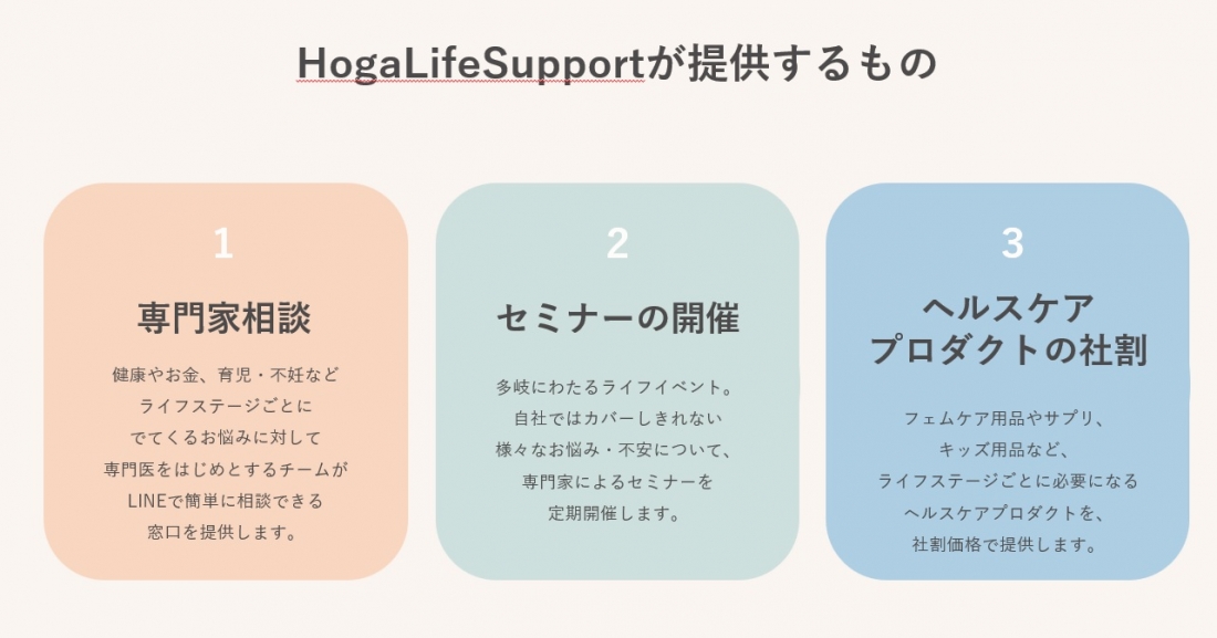 本サービスでは「専門家相談」「セミナーの開催」「ヘルスケアプロダクトの社割」の3つを提供しています。