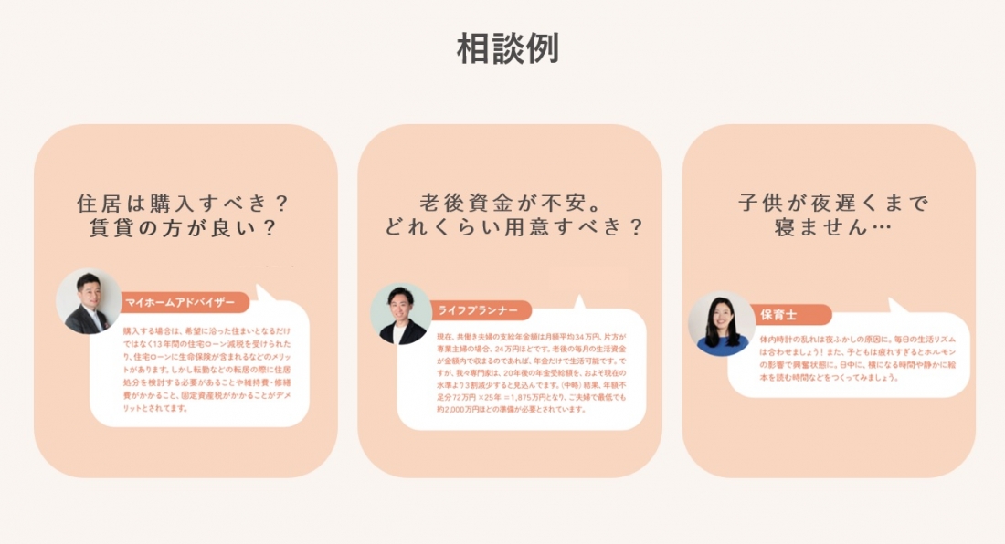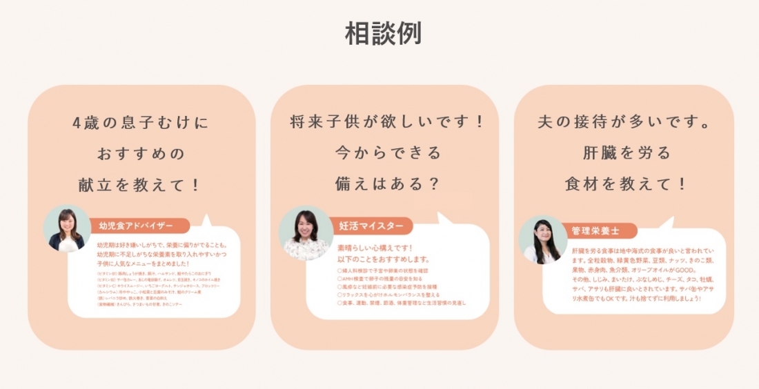 現在、ダイエットアドバイザー・保育士・夫婦カウンセラー・毛髪診断士・薬剤師・助産師・管理栄養士・看護師・妊活マイスター・胚培養士・キャリアアドバイザー・ライフプランナー・マイホームアドバイザー・育休後アドバイザー・離乳食アドバイザー・幼児食アドバイザー・ケアマネージャーといった17名の専門家が在籍しています。